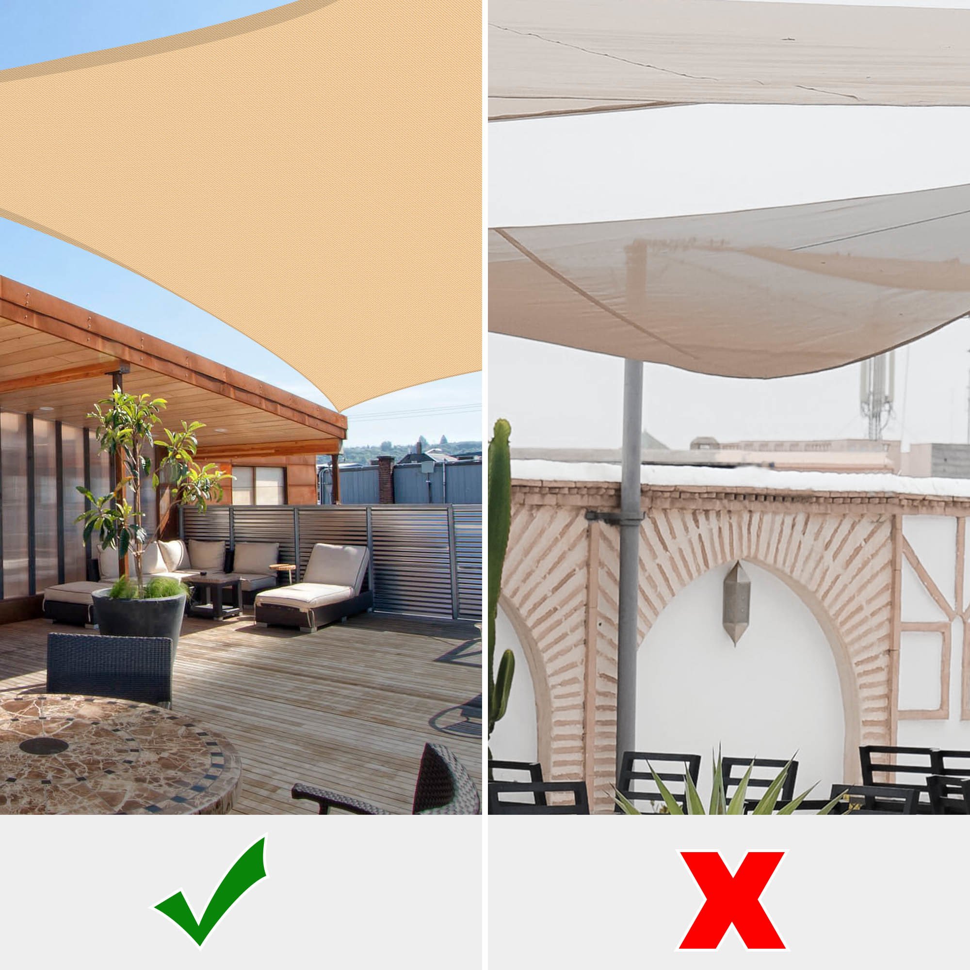 - Durable in Use - Triple stitched seam reinforces the edge to prevent fraying and ripping; Curved square shape helps the sail to keep tight; Heavy-duty nylon ropes included; Anti-ager composition added for long time service