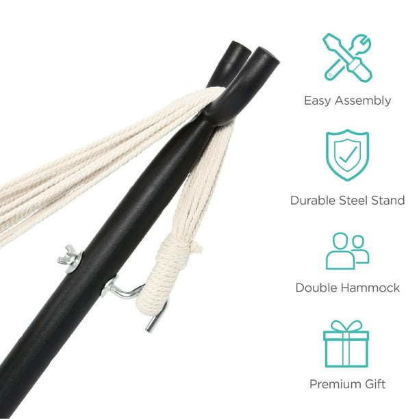 A double hammock provides a comfortable space for relaxation whether you're camping or spending time at home.Hammocks come with a 10FT steel stand that is secure and stable.Relax at your maximum with this double hammock. Take it on the go for portable & durable use. Tool-free assembly & easy disassembly means you can set up anywhere! Woven cotton conforms to your body for unseen levels of relaxation and ultimate comfort. This premium gift has every feature you need, including its double hammock style, durable steel stand, and easy assembly. Perfect for indoor/outdoor use, this hammock holds up to 450 pounds with the help of a reinforced metal support ring and a cotton polyester blend.