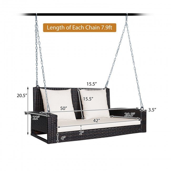 Solid steel chains ensure stable and safe swinging Sturdy and anti-rust steel for long-time usePE rattan surface is high-quality and weather resistant2-seat design enhances communication with friends2 back cushions and 1 seat cushion offer extra comfortZippered design makes maintenance much easierCan be hanged in multiple occasions with two strong steel chainsPlease purchase extra chains if you want to hang the swing on the ceilingEasy assembly with clear instructions and all hardwar