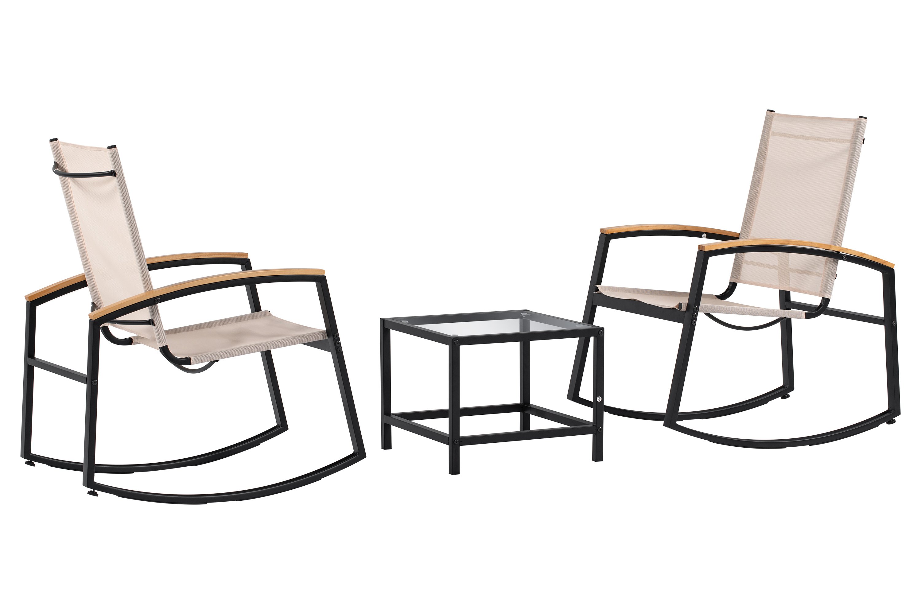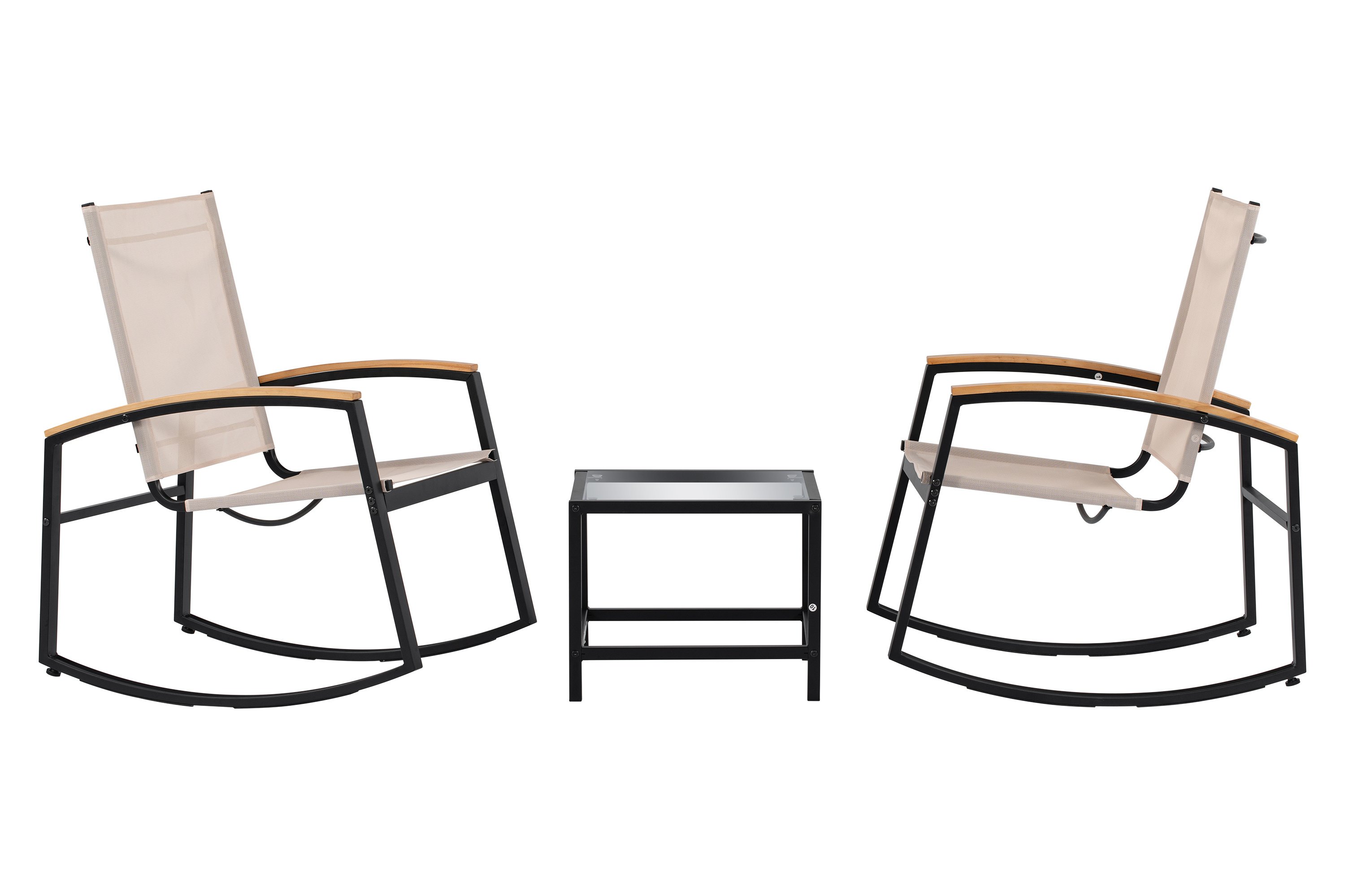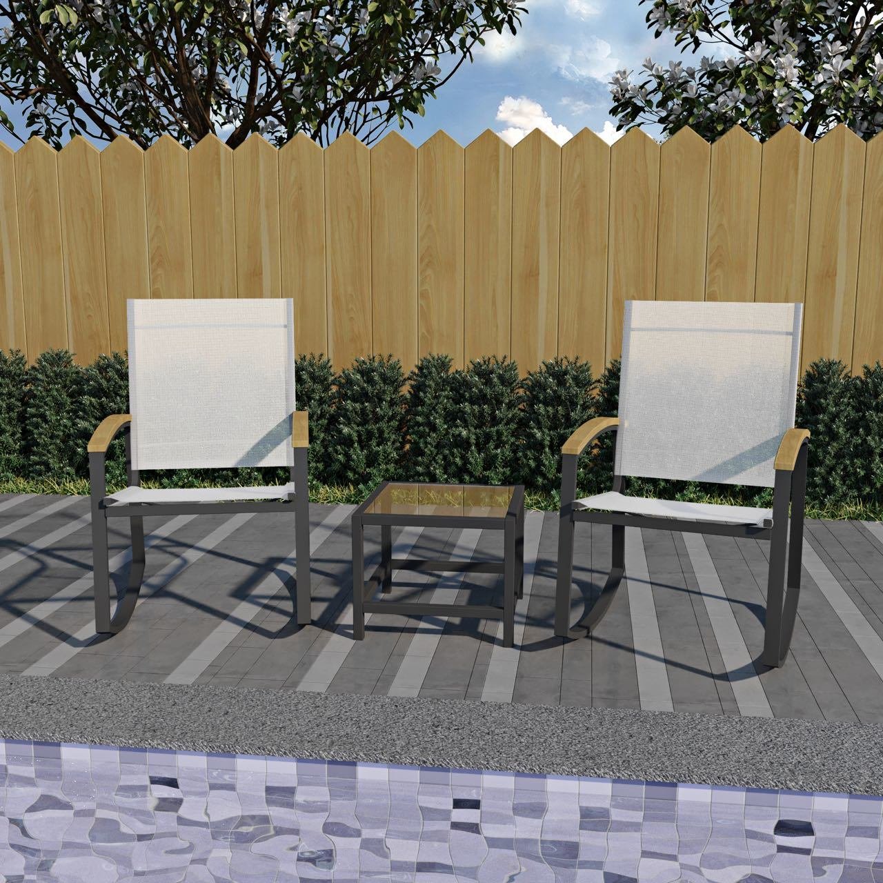 3 Piece Patio Set for OutdoorCreate the most relaxing area in your home. Designed for your comfort with a modern style, this outdoor set is the most ideal choice for balcony, garden, yard or porch. This 3-piece rocking patio set will give you the most chilling atmosphere with a breeze and a glass of wine during the evening or the weekend, whether you are alone or chatting with your dear partner or friend.