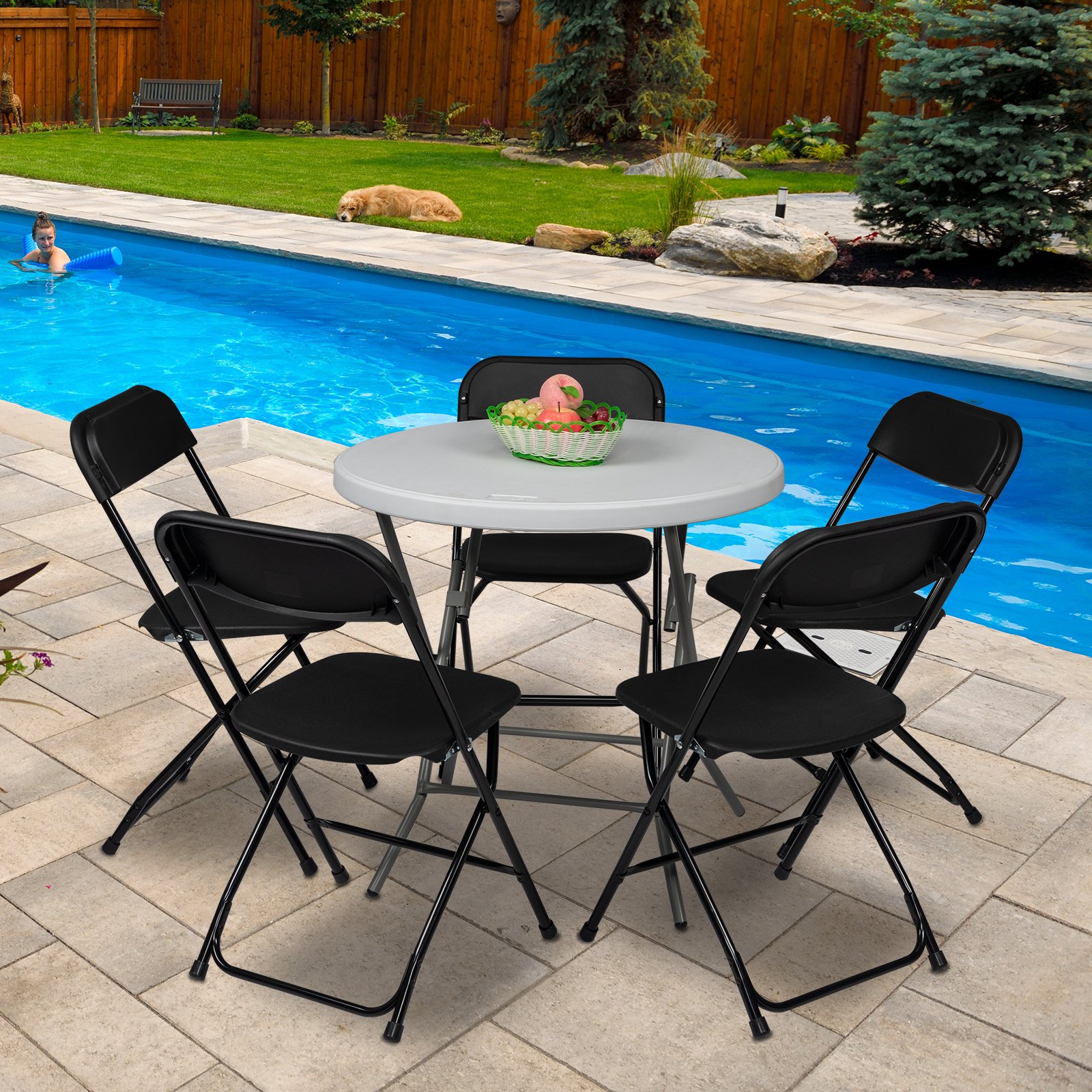 Package Includes:5 x Plastic Folding ChairsNOTE:ONLY CHAIRS; NOT INCLUDE TABLE