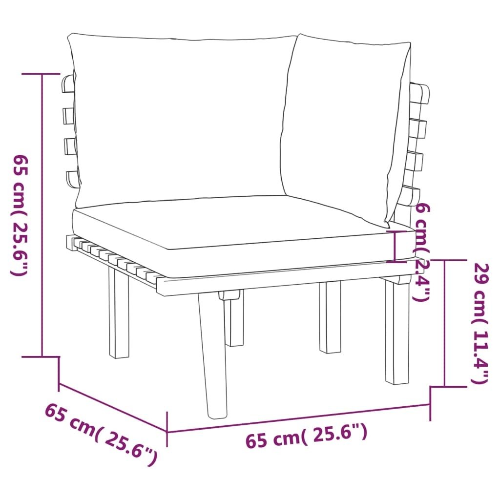 Storing: If possible; store in a cool; dry place indoors. If the product is stored outdoors; protect it with a waterproof cover. Wipe and dry the excess water or snow from flat surfaces after a rain or snowfall. Allow sufficient air circulation to avoid moisture-related damage.Cushion color: Dark gray; whiteMaterial: Solid acacia wood; fabric (100% polyester)Footrest dimensions: 23.6" x 23.6" x 11.4" (W x D x H)Table dimensions: 35.4" x 21.7" x 13.8" (W x D x H)Seat cushion dimensions: 21.3" x 23" x 2.4" (W x D x T)Back cushion dimensions: 15.7" x 15.7" x 3.9" (W x D x T)Middle sofa:Middle sofa dimensions: 23.6" x 25.6" x 25.6" (W x D x H)Seat depth: 23.6"Seat height (excluding cushion): 11.4"Seat height (including cushion): 13.8"Corner sofa:Corner sofa dimensions: 25.6" x 25.6" x 25.6" (W x D x H)Seat depth: 23.6"Seat height (excluding cushion): 11.4"Seat height (including cushion): 13.8"Assembly required: YesDelivery contains:2 x Middle sofa1 x Footrest1 x Table1 x Corner sofa4 x Seat cushion4 x Back cushion