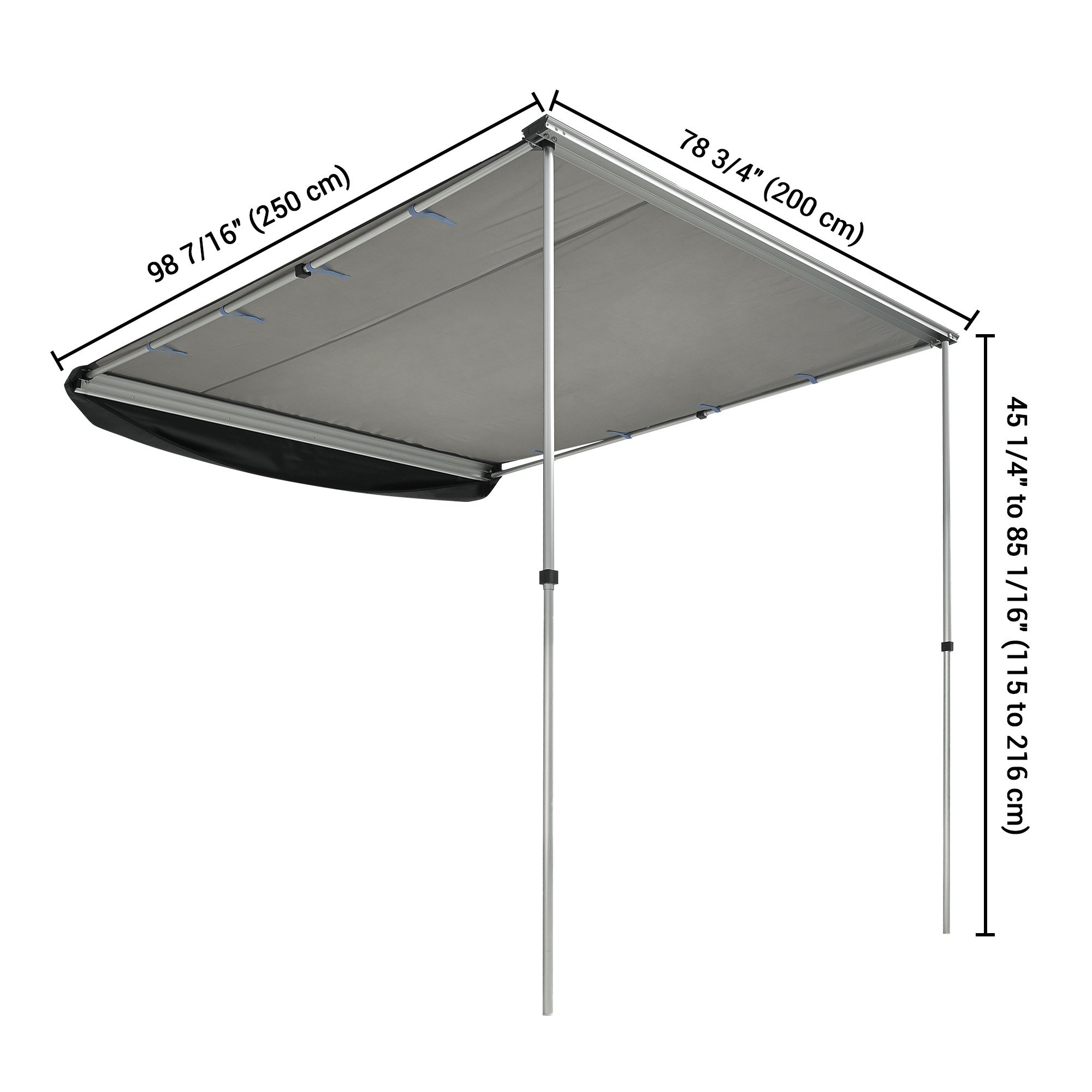 - Compatibility - 98 7/16" x 78 3/4" x 85 1/16" Car Side Awning offers 54 sq.ft large shading area for outdoor activities; fits most vehicles with rooftop rails and compatible with rail width less than 3 3/8", distance between rail and roof more than 13/16" and the space of mounting 2 brackets should be more than 39 3/8" in length