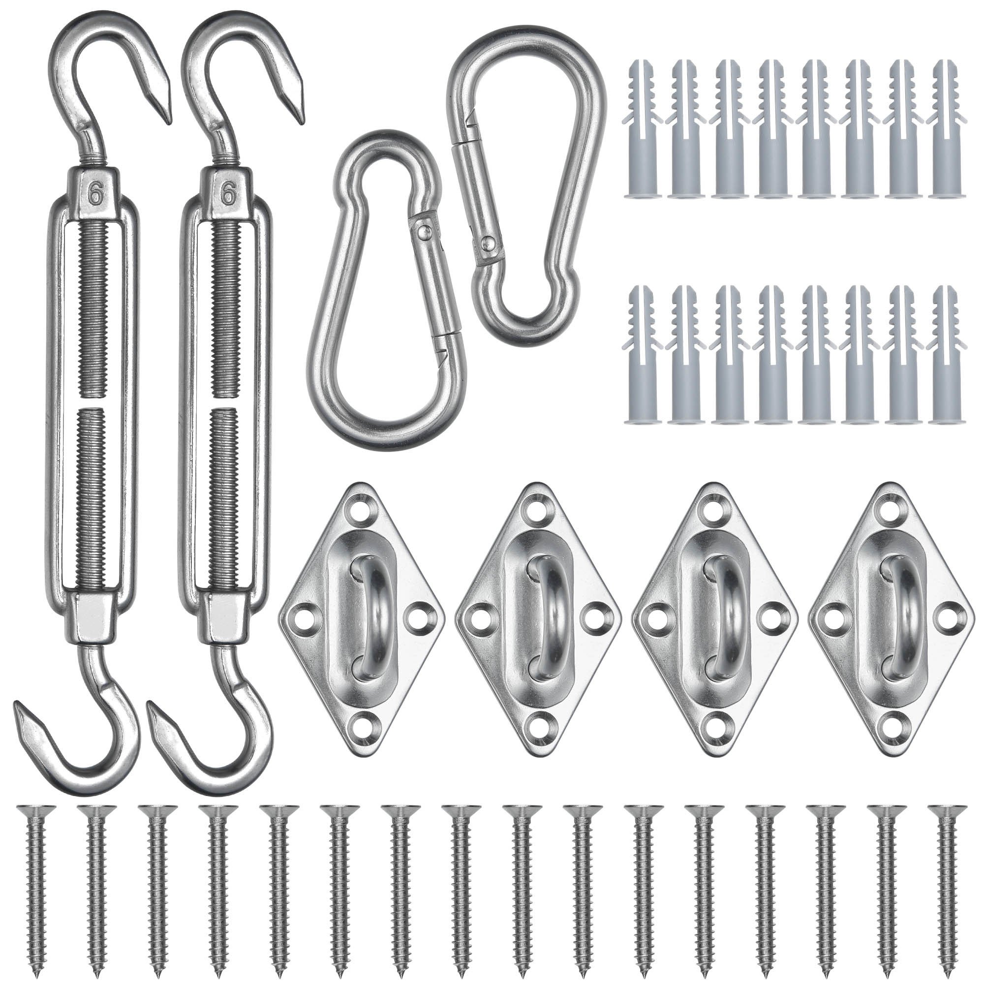 - Wide Application - All in 1 Universal Rectangle/Square Sun Shade Sail Hardware Kit includes 2 turnbuckles, 4 pad eyes, 2 carabiners and a set of screws, to hang the sun shade sail steadily on the wall, tree or pole, great for using at patio, garden, coffee shop and swimming pool