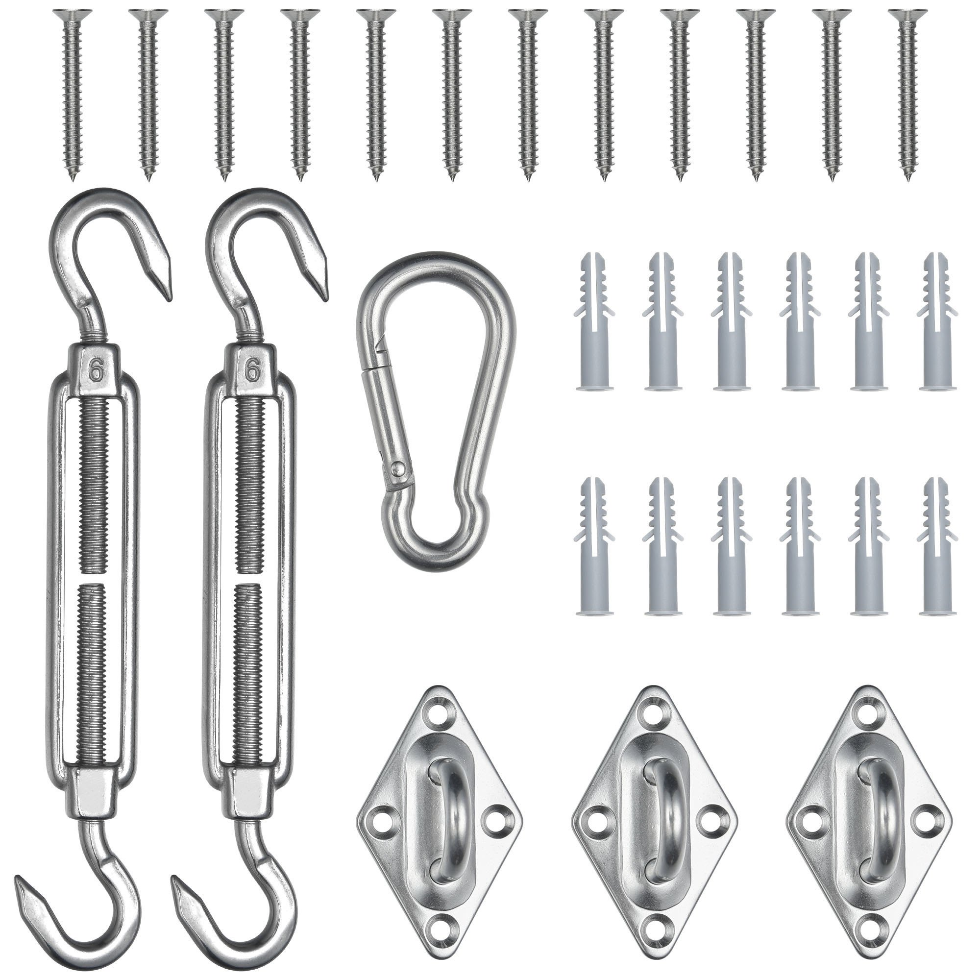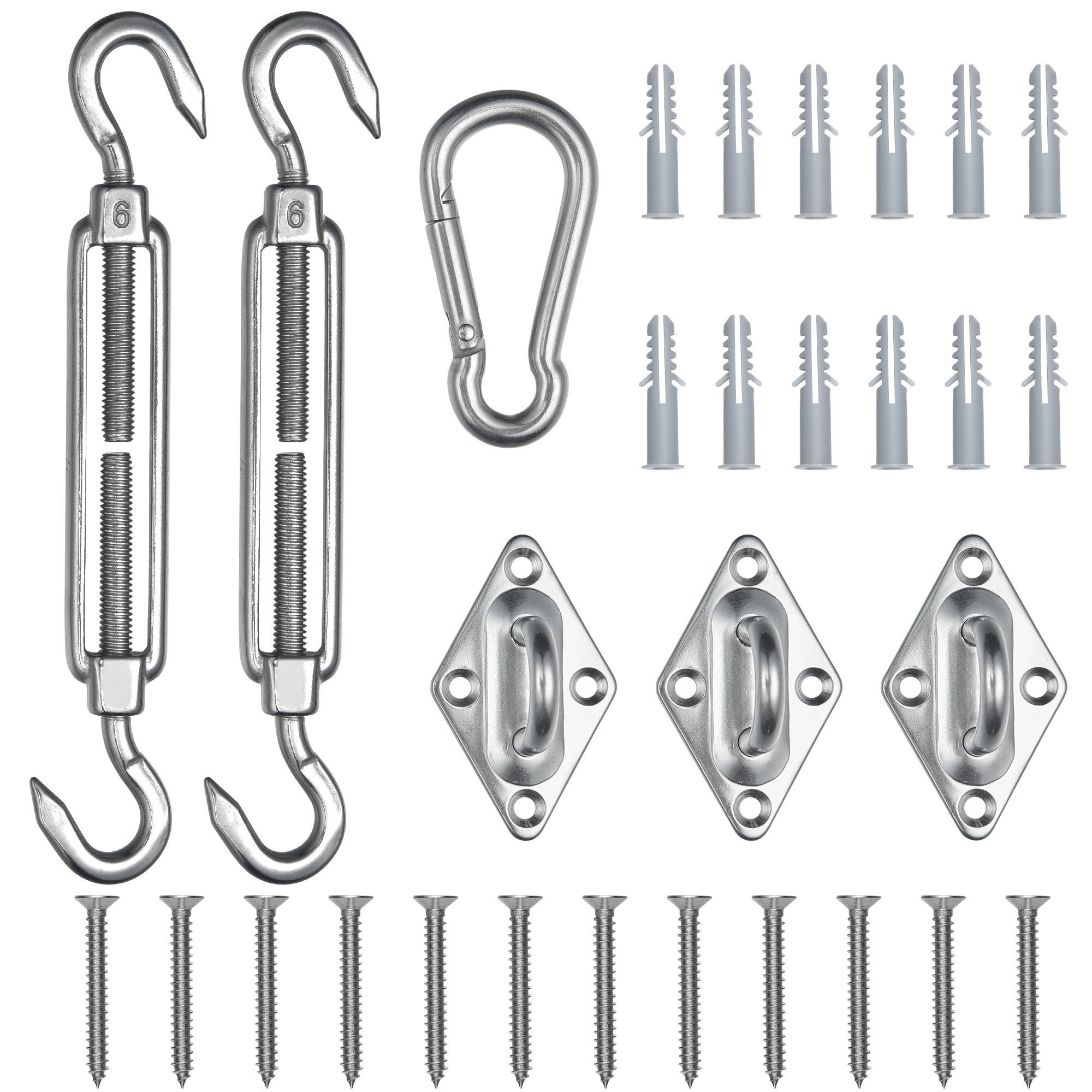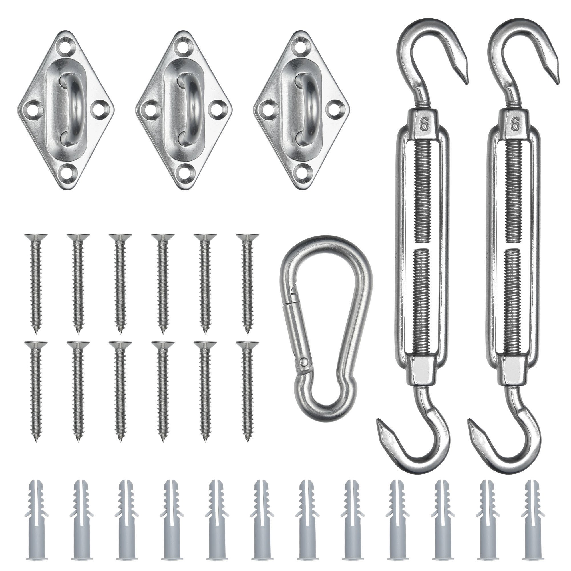 - Wide Application - All in 1 Universal Triangle Sun Shade Sail Hardware Kit includes 2 turnbuckles; 3 pad eyes; 1 carabiner and a set of screws; to hang the sun shade sail steadily on the wall; tree or pole; great for using at private patio; garden; coffee shop and swimming pool