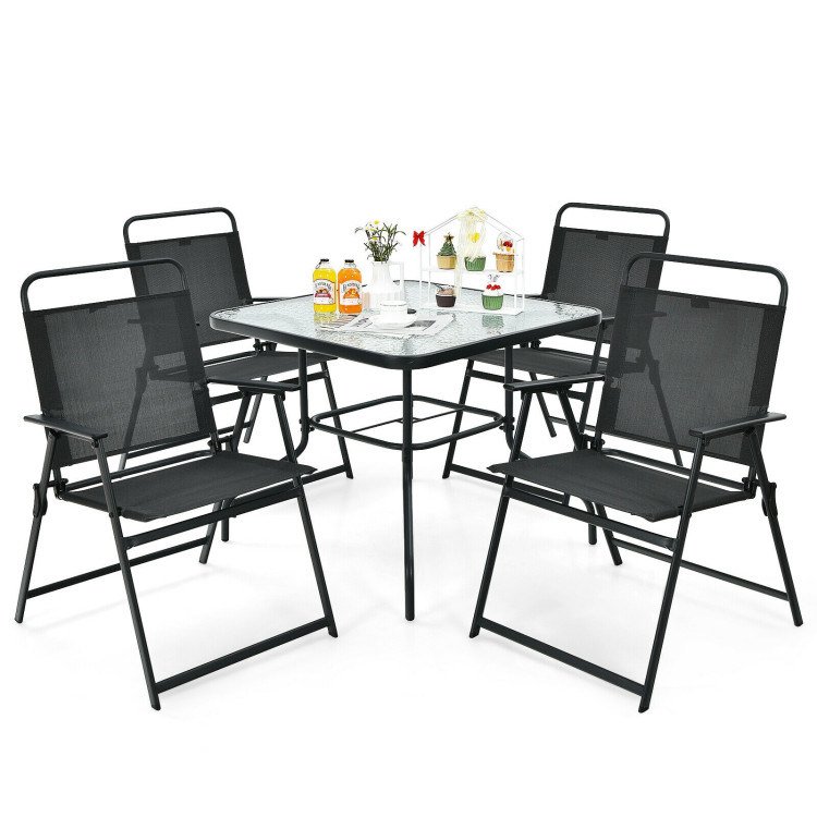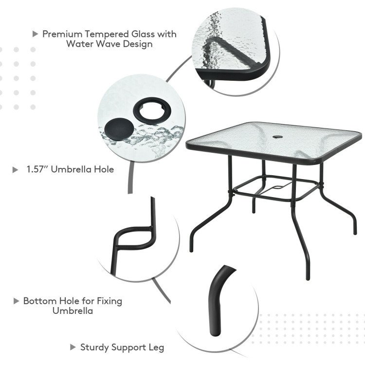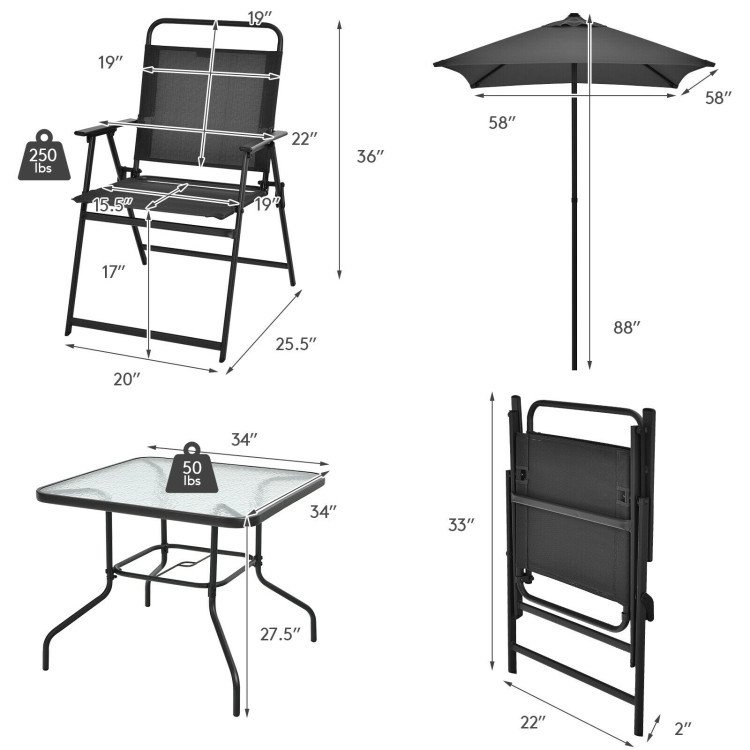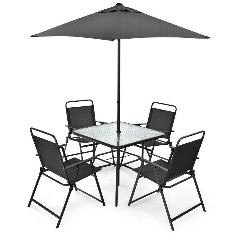 Including a patio umbrella; tempered glass table and 4 ergonomic chairs; this 6-piece outdoor dining set not only protects you from direct sunlight; but provides a comfortable sitting experience. Moreover; made of anti-rust steel frame; waterproof polyester and breathable fabric; this outdoor table and chair set is perfect for outdoors; so you can put it wherever you want. Considering your convenience; the smooth tabletop with water wave design is easy to clean. And 4 folding chairs save your outdoor space.