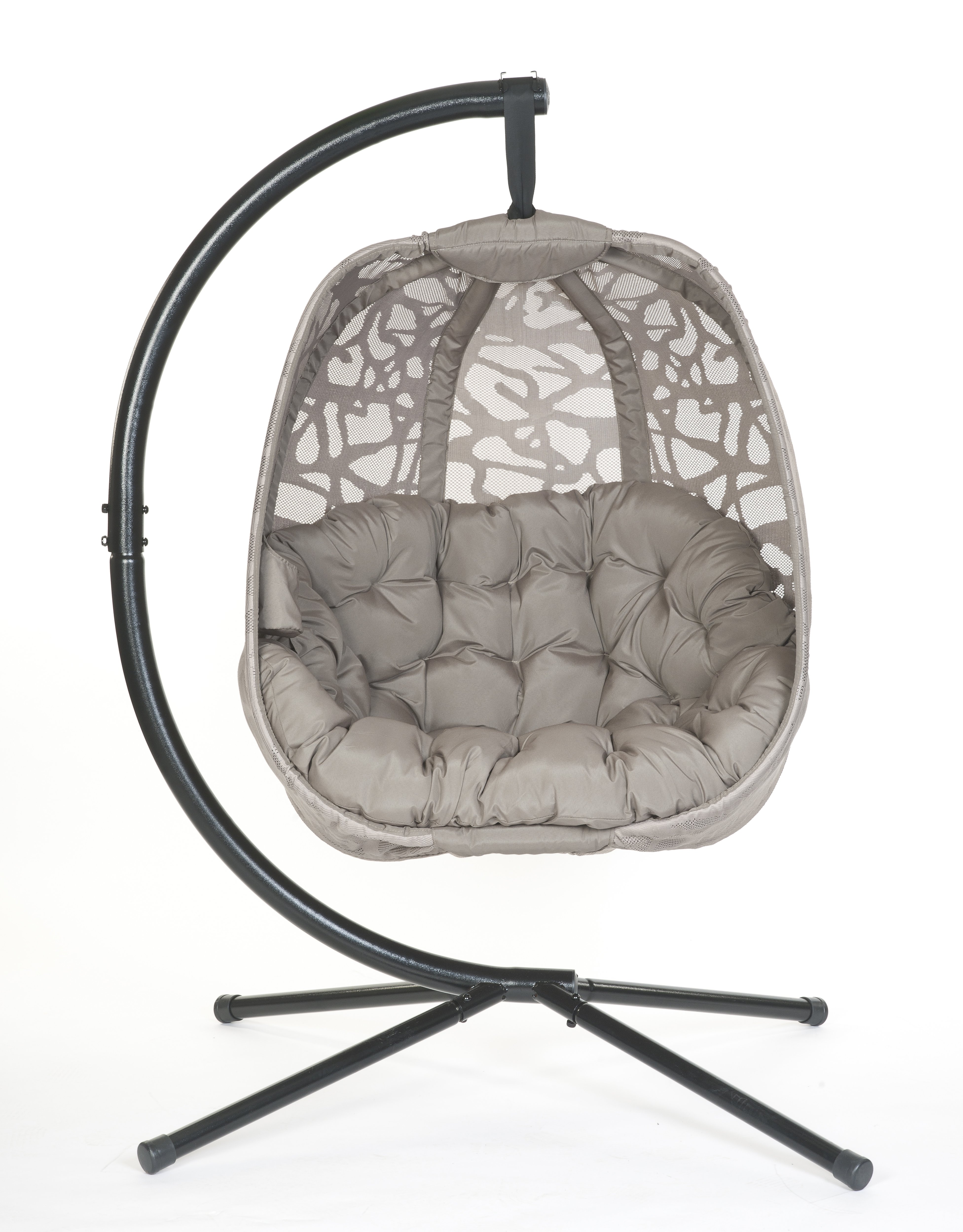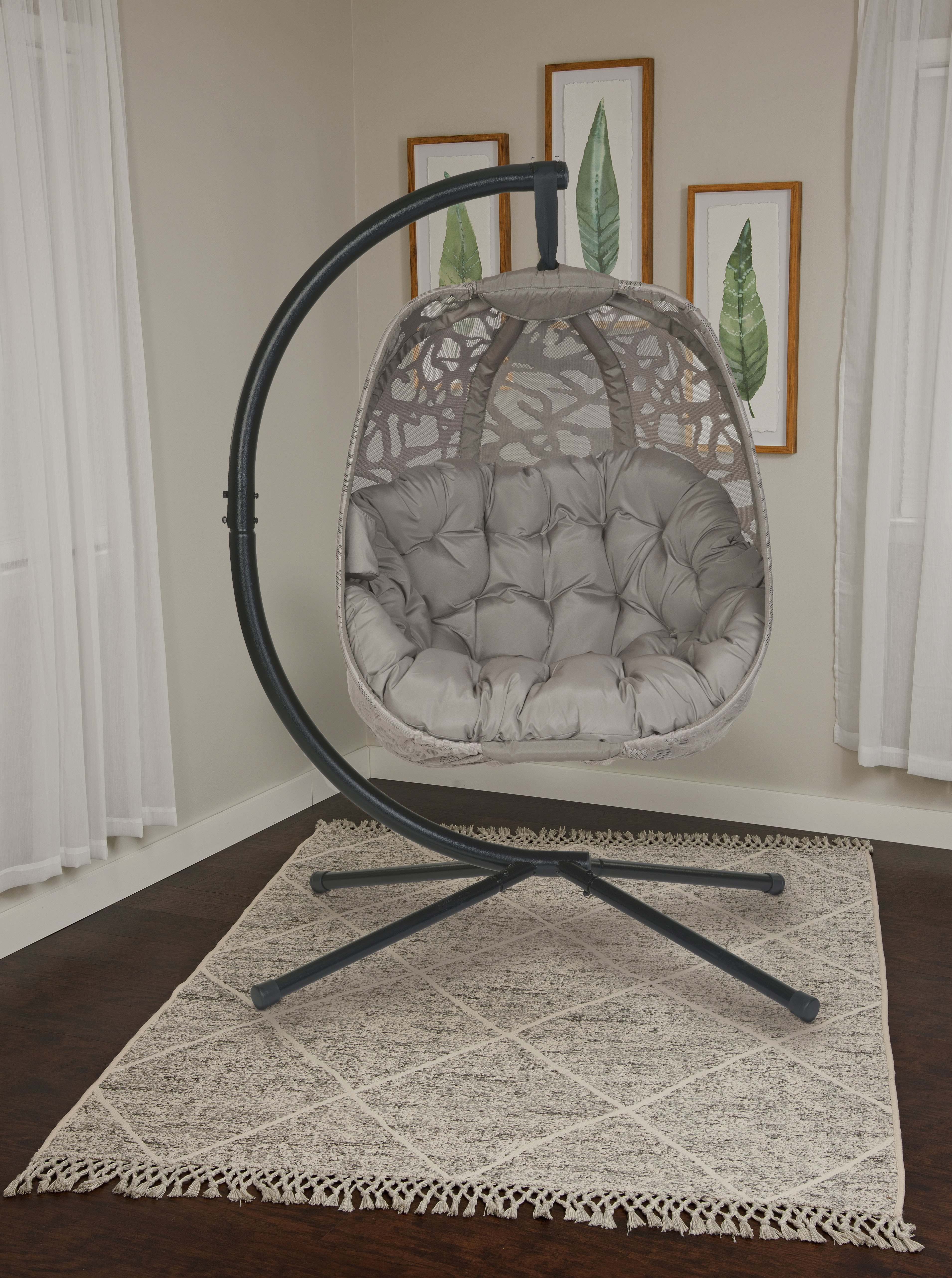 66 H x 34 W x 43 D Outdoor Beige Hanging Egg Patio Chair with Cushion, C Type Bracket, and Branch Design - as Pic