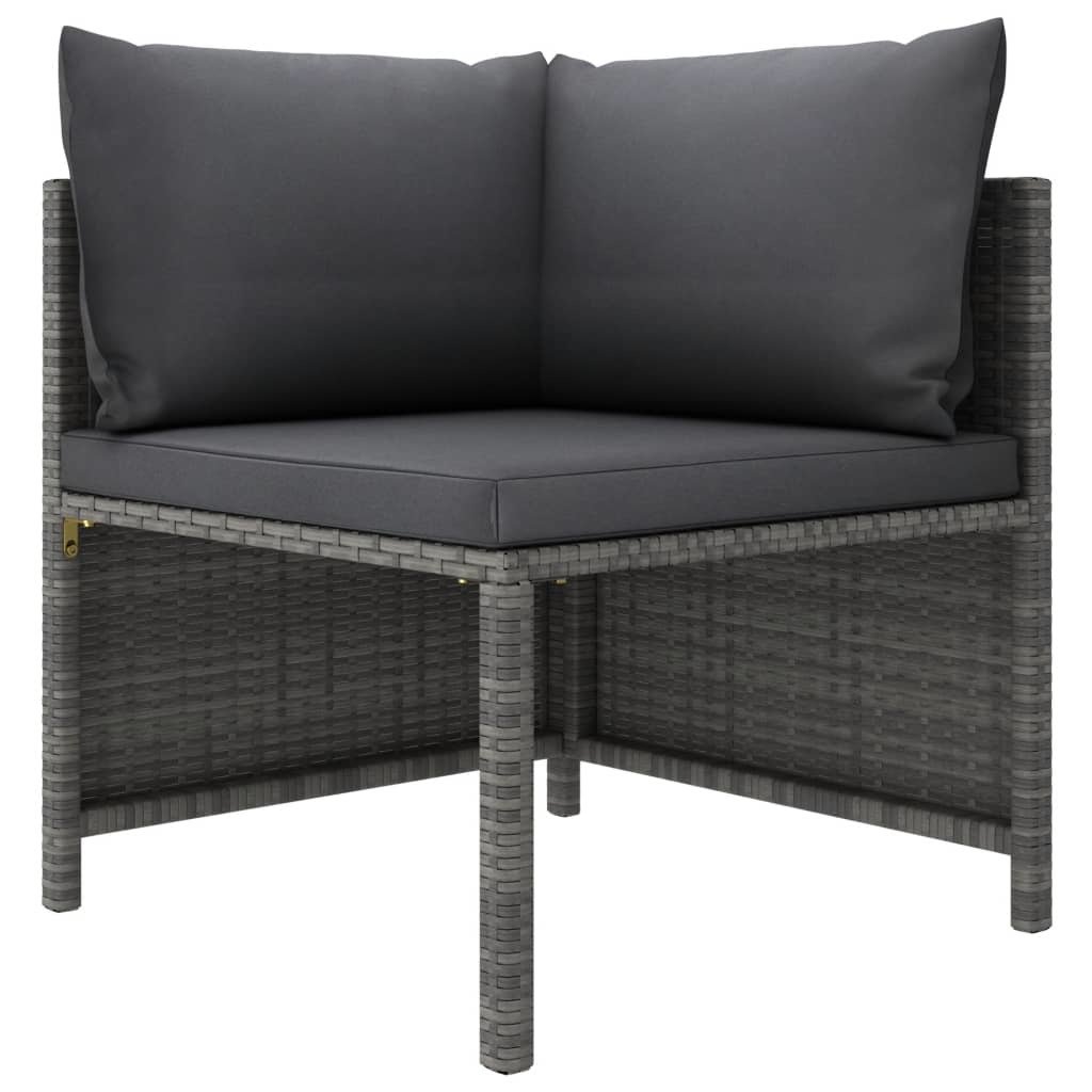 Important note: We recommend covering the lounge set during rain; snow and frost for its best service to last.Color: GrayColor of cushion: AnthraciteMaterial: PE (polyethylene) rattan; powder-coated steelMaterial of cushion: Fabric (100% polyester)Filling material of seat cushion: FoamFilling material of backrest cushion: Fiber cottonSeat cushion thickness: 2"Backrest cushion thickness: 5.9"Corner Sofa:Dimensions: 23.6" x 23.6" x 23.6" (W x D x H)Seat width: 22.4"Seat depth: 22.4"Seat height from the ground: 12.6"Middle Sofa:Dimensions: 21.3" x 23.6" x 23.6" (W x D x H)Seat depth: 22.4"Seat height from the ground: 12.6"Assembly required: YesDelivery contains:4 x Corner sofa5 x Middle sofa9 x Seat cushion13 x Back cushion