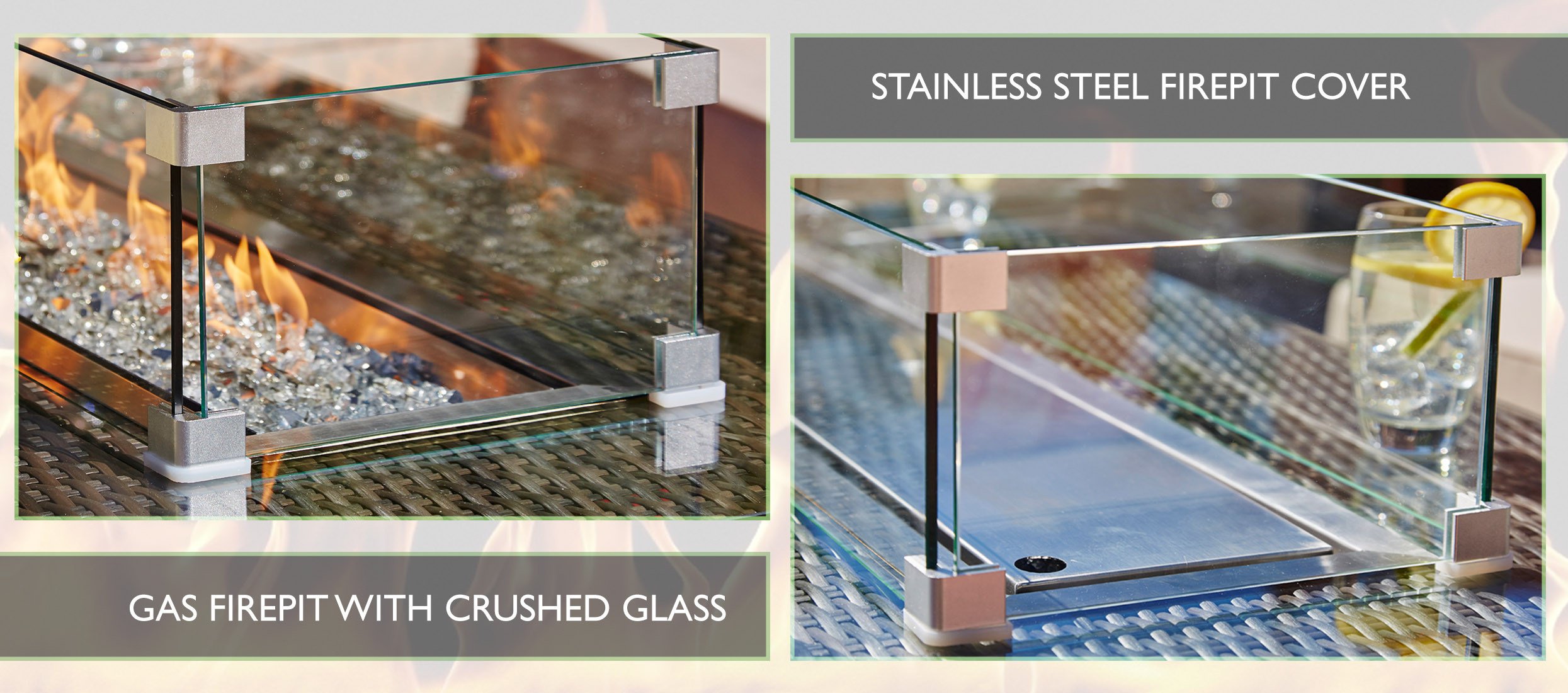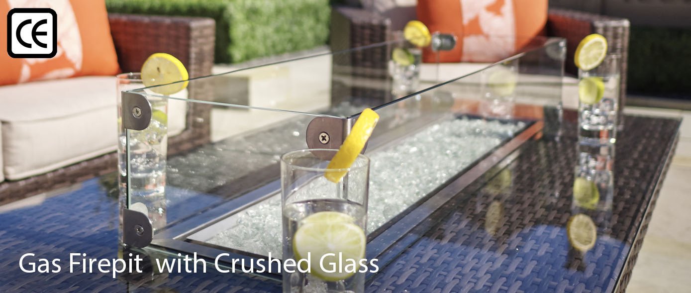 2. The set is not only a beautiful and focal central piece for your garden but is also very practical. The table has a heat adjustable stainless steel gas fire-pit. The flames emerge from the crushed glass central feature and will keep you warm and comfortable long after the sun goes down; enabling you to continue relaxing long into the night.3. The benefits do not end there as you also have the option of adding a BBQ grill plate or integrated drinks cooler. The BBQ grill is simply placed over the flames so that you can enjoy some al fresco dining to enhance your luxury outdoor experience. For those hot sunny days when you feel the need to cool off; just simply add the integrated drinks cooler in place of the fire pit. If you are looking for the ultimate in stylish heating; dining or entertaining; then you have found it with our unique Gas fire pit table.