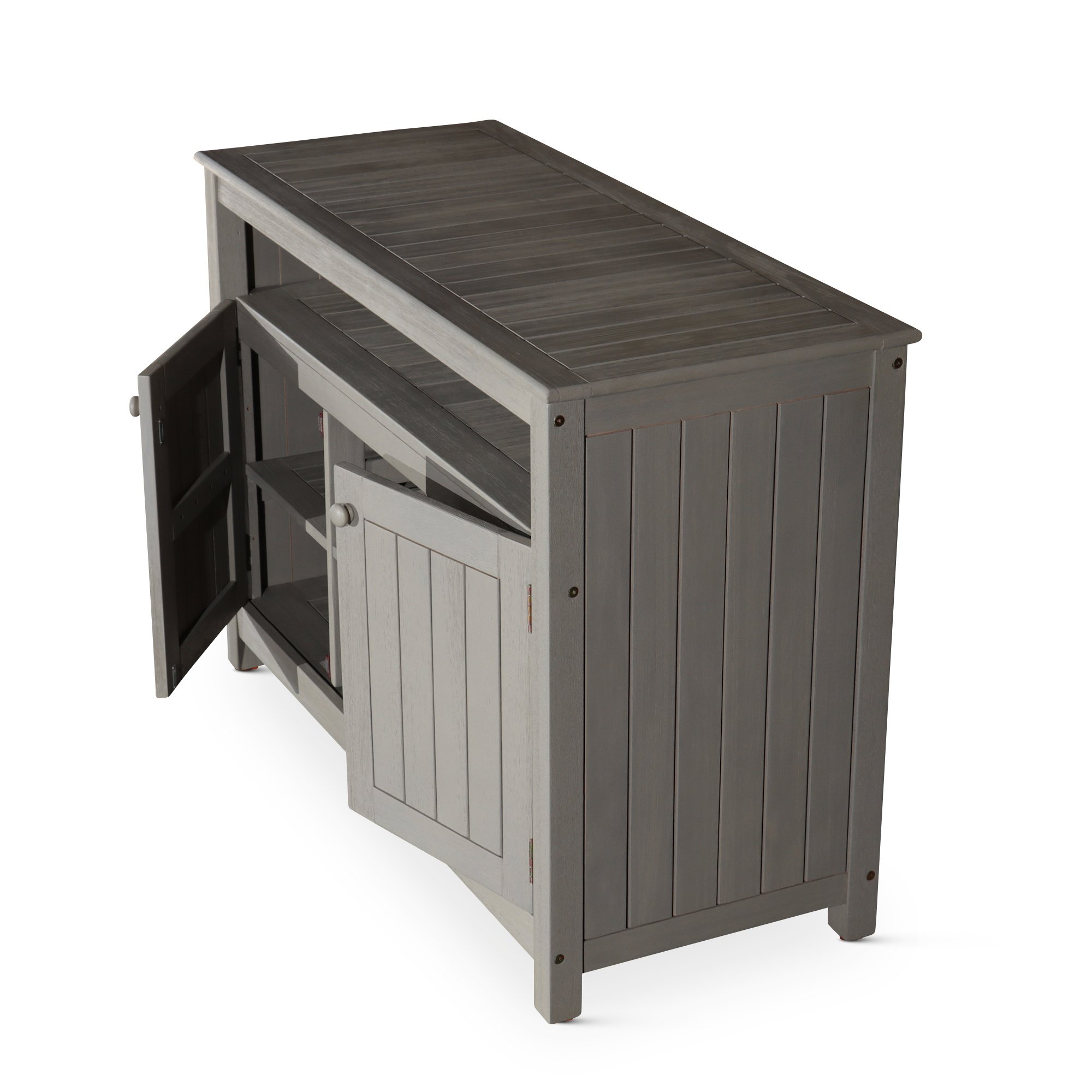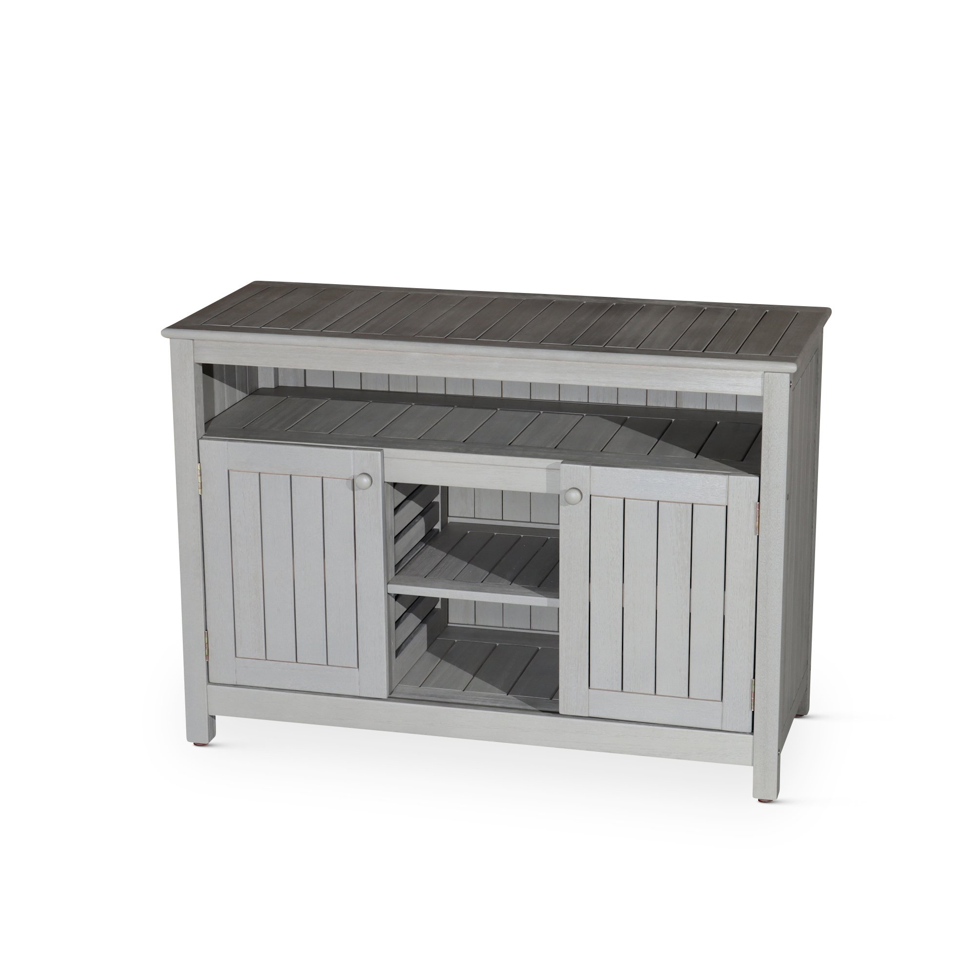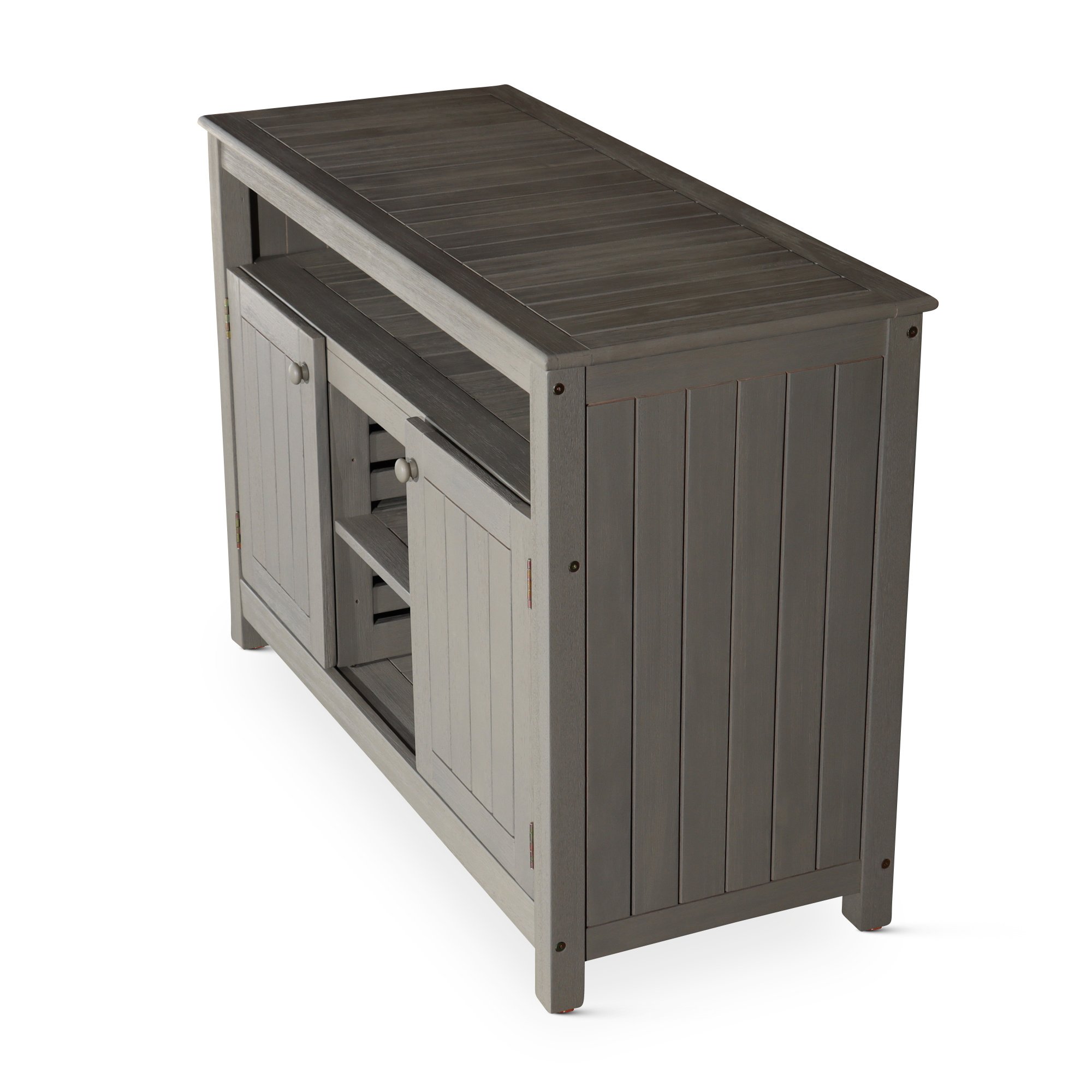 Eucalyptus Sideboard, Driftwood GrayTake your outdoor entertaining to new heights. This attractive sideboard is sure to be the focal point of your outdoor space. The large surface area is perfect an outdoor buffet, bar or prep area. The sideboard includes an open middle shelf and center area as well as slatted cabinets with adjustable shelves for storage of everyday essentials. The adjustable floor levelers help keep the piece stable on any outdoor surface.