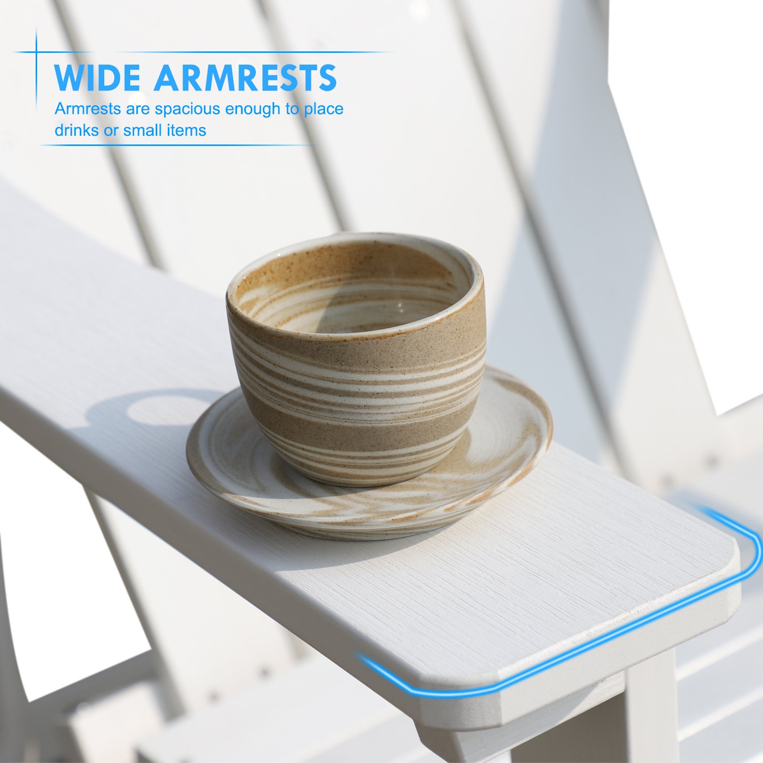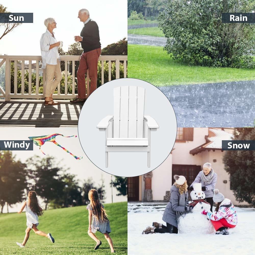 [Can't Decide? Go for Aok Garden HIPS!]This eco-friendly version of the iconic Adirondack chair replaces traditional wooden slats with recycled plastic ones. Stronger and more durable than treated wood, it's also waterproof and requires no maintenance[Feel the Texture under Your Fingertips]The details of the wood texture are showcased in full. This outdoor chair incorporates traditional Adirondack elements and expertly emulates the appearance of natural wood, with a polished texture that highlights intricate grain patterns[Why Choose Non-Folding Model?]More sturdy, durable, and stable, the non-foldable Adirondack chair is suitable for long-term outdoor use. Due to its wider base and thicker plate, it offers better comfort. Additionally, it is less prone to damage from folding and unfolding[Solid Craftsmanship, Durable Quality]The HIPS utilized in constructing this fire pit chair is robust enough to endure strong winds and unaffected by wet weather and extreme temperatures. It will stay in place without rotting, warping, cracking, or splintering, and never requires repainting[Enhancing Comfort for Outdoor Enthusiasts]This Adirondack chair offers roomy seats with sloped reclining backs that support your spine. The wide armrests provide enough room for your phone or drink, while the seat height is scientifically designed to allow for easy getting up and out of the chair[Assembly in 15 Minutes: 6 Parts, 4 Steps]Our Adirondack chair is designed for easy and efficient assembly. With our detailed instructions and installation video, you can complete the assembly process in only 15 minutes, with just four simple steps