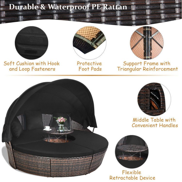 Durable and sturdy steel frame tokeep stableLightweight and premium PE rattan material for long lifespanEquipped with adjustable table to meet differentrequirementsWeather resistant retractablecanopy can be used to block sunlightSoftcushions and pillows for comfortable seating experienceStylish and modern design is ideal for patio; balconyand poolsideThe daybed can be separatedinto 3chairsfor multiple usesThe cushion features with zippers for easy cleaningEasy to assemble