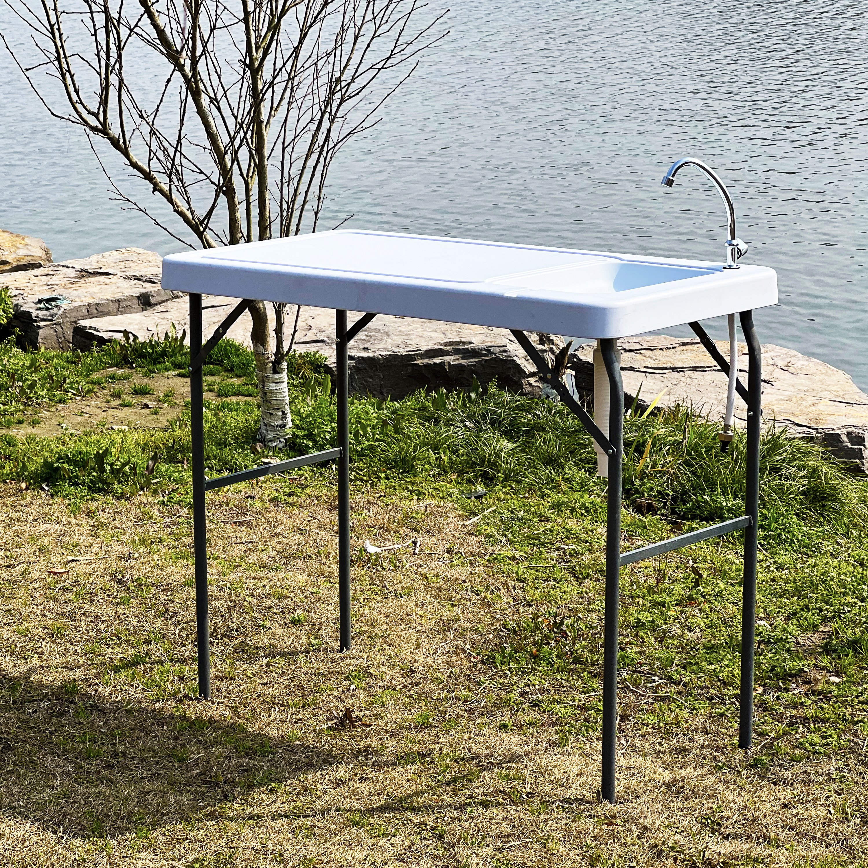 This portable Fish Cleaning Camp Table with Flexible Faucet lets you clean your catch the right way — without mess or hassle. Easy to move and set up; this table is also perfect for tailgating or backyard parties. The stainless steel faucet features a flexible sprayer that hooks up to a standard garden hose to provide fresh water. A containment groove in the table channels liquids into the sink; and the flexible drain hose lets you empty the sink into a bucket or floor drain to minimize cleanup. Legs lock in both the folded and upright positions.
